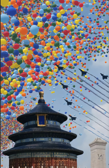 紅艷絨布為卷,金色“國慶”躍然其上,飛機曳著彩練掠過長空,天壇在祥云間矗立。愿山河無恙、家國永昌,祝偉大祖國繁榮昌盛!
