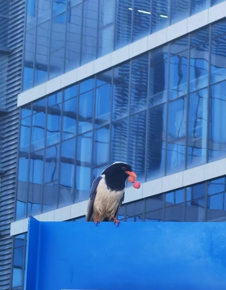 圖注:這張照片是在研究院園區(qū)巧妙抓拍,呈現(xiàn)了自然與現(xiàn)代的有趣交融。畫面里,紅嘴藍(lán)鵲穩(wěn)穩(wěn)地站在藍(lán)色平臺邊緣,口中銜著飽滿紅果,神態(tài)悠然。身后玻璃幕墻高樓林立,映射出研究院的科技感。這只鳥兒仿佛是城市中的靈動精靈,在鋼筋混凝土間尋得一方天地。這一瞬間,既展現(xiàn)...